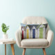 Dieses hübsche Kissen eignet sich ideal für eine Zuhause mit Meeresmotiven und bietet traditionelle, bunte Strandhütten aus Holz. Sie sind aus Holz, weiß mit Türen in primärem Rot, Gelb, Blau und Grün gestrichen.
