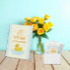 Eine glückliche Ente! Zum ersten Geburtstag mit einer Gummiente und Bläschen gegen einen hellblauen Gingham und hellgelben Hintergrund mit orangefarbenem Text. Bildvorlage über Pixabay, lizenziert unter CC0 und muss durch Ihr eigenes Foto ersetzt werden