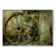 Old Wagon wheel with a clematis vine foto with an antike grunge overlay greeting card to remember times gone past.