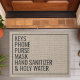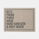 Dieses witzige Türdesign enthält die Worte "Schlüssel, Telefon, Handtasche, Maske, Hand Sanitäter, Heiliges Wasser". Personalisieren Sie diese niedlichen rustikalen Imitate bedecken Türmatte mit Ihrem eigenen, die Erinnerungen verlassend Haus. Die perfekte moderne Hauswärmung oder das Geschenk neuer Hausbesitzer.