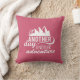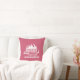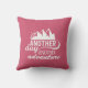 Ein Kissen mit einem inspirierenden Abenteuer/Reiseangebot, das sagt: Ein weiterer Tag ein anderes Abenteuer. Ein Bild mit der Sonne, die hinter einigen Bergen herausschaut. Set auf einem korallenrosa Hintergrund.