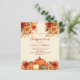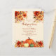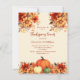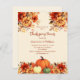 Ein zarter, beige Hintergrund. Die Einrichtung ist mit Kürbissen und orangen und gelben Blumen geschmückt. Personalisieren Sie die Party-Details und fügen Sie sie hinzu. 1 Blatt = 1 Einladung mit Druckkante bis Kante.