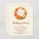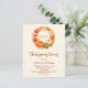Ein warmer, sanfter, beigefarbener Hintergrund. Dekoriert mit einem Kranz im Untergang, Orangenblättern und Kürbissen. . Mit dem Text: Erntedank Dinner geschrieben mit einem modernen handgeschriebenen Stil Skript. Personalisieren und fügen Sie die Details hinzu. 1 Blatt = 1 Einladung mit Druckkante bis Kante.