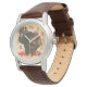 Die klassisch braune Lederrippenuhr mit einem Vintage-Bild eines herzhaften Truthahns mit roten und goldenen Herbstblättern und zu seinen Füßen auf gelben und orangefarbenem Grunge. Optionale Silber-Uhr-Oberfläche. Siehe dazu passendes Acryl-Fotoskulptur-Button, Rundcharm, großer quadratischer Premiummetall-Schlüsselanhänger, viereckiger beidseitig bedruckter Acrylfotoskulptur-Schlüsselanhänger und Acryl-Fotoskulptur-Schlüsselanhänger. Sehen Sie sich die gesamte Erntedank-Watch-Sammlung unter der Rubrik ACCESSORIES im Bereich HOLIDAYS an.