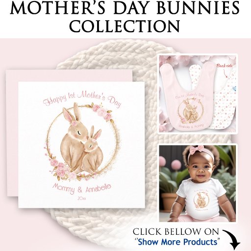 Erste Muttertagskarte mit niedlichen Bundys und rosa Blume, weiß und rosa für Mami und Tochter. Personalisieren Sie den gesamten Text einfach. Kate Eden Art