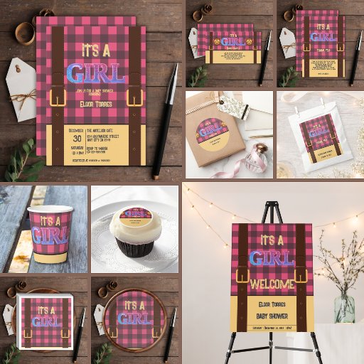 Die It's a Girl Rustic Lumberjack Flannel Baby Shower Collection verbindet den rauen Charme der Natur mit weichen femininen Touchs. Mit karierten, rustikalen Holztexturen in Rot und Schwarz und süßen Akzenten wie rosa Bögen und Flanellherzen schafft diese Kollektion eine gemütliche, woodsy Atmosphäre, um die Ankunft Ihres kleinen Lumberjack-Mädchens zu feiern!