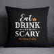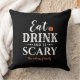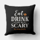 Dieses beängstigende niedliche Halloween-Kopfkissen zeigt die Phrase "Trink essen und Beängstigend sein" in einem modernen, weißen Typografie-Design mit einem orangen Jack o'lantern Kürbis-Akzent. Personalisieren Sie das Skript mit Ihren Namen / Familiennamen oder mit anderen Texten wie "glücklich halloween". Schwarzer Hintergrund kann angepasst werden.