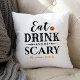 Dieses beängstigende niedliche Halloween-Kopfkissen zeigt die Phrase "Esst Drink and Be Beängstigend" in einem modernen, schwarzen Typografie-Design mit einem orangen Jack o'lantern Kürbisakzent. Personalisieren Sie das Skript mit Ihren Namen / Familiennamen oder mit anderen Texten wie "glücklich halloween". Weißer Hintergrund kann angepasst werden.