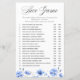 Shoe Game Card für Ihren Polterabend oder Ihr Brautparty, wenn der Bräutigam einspringt. Einfaches und lustiges Spiel mit dem glücklichen Paar und seinen Gästen. Das Design zeichnet sich durch eine elegante Kalligraphie und eine Aquarellblume mit hübsch blauen Blumen aus. Dieses delikate Brautparty-Design in Blau und Weiß ist perfekt für das blaue Brautparty, botanische Themen und Frühling oder Sommer Polterabend. Für die Koordinierung von Einladungen, Schreibwaren und Dekorationen während der Veranstaltung, lesen Sie bitte in meiner "Something Blue Floral Brautparty Collection" nach oder schreiben Sie mir, um zusätzliche Elemente hinzuzufügen, die Sie benötigen.