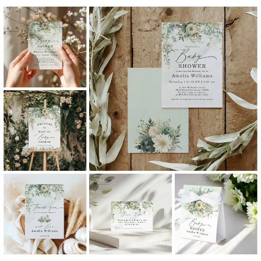 rustikales thema babyduscheweiße und grüne babyduscheneutrales botanisches themaaquarell babyduschegeschlechtsneutrale babyduscheeukalyptusblätterungblütenduschegrünplattemoderne babyduschebabyduschvorlage