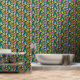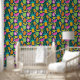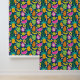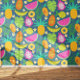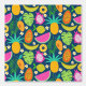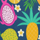 Niedliche, lebendige tropische Früchte mit Ananas, Papaya, Drachenfrucht, Mango, Banane, Wassermelone und Zitrone mit tropischen Blätter im dunklen Hintergrund