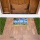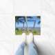 Eine Fußmatte mit einer Fotografie eines bunten blauen und grünen Fahrrades durch den Ozean, mit Palmen, in Florida, mit dem Wort Willkommen.