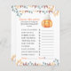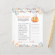 "Ein kleiner Kürbis ist unterwegs. Feiern Sie mit diesem Baby Cartoon Kürbis Thema für Baby Dusche Party! Wasserfarbener niedlicher Cartoon Kawaii Kürbis mit Herbstmütze (Kappe) und Herbstlauben. Auf der Rückseite der Karte befinden sich Herbstblätter.