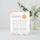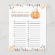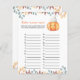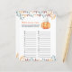 "Ein kleiner Kürbis ist unterwegs. Feiern Sie mit diesem Baby Cartoon Kürbis Thema für Baby Dusche Party! Wasserfarbener niedlicher Cartoon Kawaii Kürbis mit Herbstmütze (Kappe) und Herbstlauben. Auf der Rückseite der Karte befinden sich Herbstblätter.