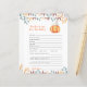"Ein kleiner Kürbis ist unterwegs. Feiern Sie mit diesem Baby Cartoon Kürbis Thema für Baby Dusche Party! Wasserfarbener niedlicher Cartoon Kawaii Kürbis mit Herbstmütze (Kappe) und Herbstlauben. Auf der Rückseite der Karte befinden sich Herbstblätter.