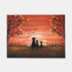 Zwei Hunde und Katzen-Silhouette, die den Sonnenuntergang auf einem Herbst-Abend aufpasst. Helle, klare orange Herbstfarben. Mit zwei Bäumen auf Seiten mit fallendem Herbst-Blätter und den Vögeln, die in Richtung zum Sonnenuntergang fliegen. Falllandschaft entwirft die ursprüngliche Acrylmalerei-Kunst, die von Donna Leger für Ironie erfolgt ist. Alle Rechte vorbehalten.