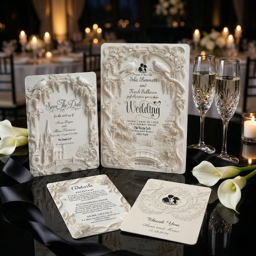 Bestimmen Sie den Ton für Ihre formelle Veranstaltung mit diesen eleganten Antwortkarten mit einem atemberaubenden Pseudo-Stuckrelief-Design. Perfekt für klassische Black-Tie-Hochzeiten. Dieses Design verfügt über einen raffinierten Trompe-l’Œil-Effekt, der die Optik von geschnitztem Stuck oder Steinrelief simuliert. Das Kunstwerk zeigt einen barock inspirierten Rahmen, bestehend aus weißen Rosen, Rosenknospen und sich windenden Reben, in einer monochromen Farbpalette aus Elfenbein, Creme und Weiß, um Tiefe und Schatten zu erzeugen. Die Typografie kombiniert eine elegante schwarze Kalligrafieschrift mit einer sauberen, modernen serifenlosen Schrift für maximale Lesbarkeit vor dem neutralen Hintergrund.
