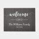 Willkommene Matte mit einem hölzernen Hintergrund des Imitats, ein hübscher weißer Kalligraphie-Schriftart und Ihr Familienname und Jahr hergestellt.