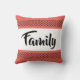 Kopfkissen mit Korallenhintergrund und schwarzes Muster auf und ab. Weiß ist in der Mitte mit dem Wort Familie in einer lustigen und hübschen Typografie. Spaß und stilvoll!