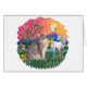 Eine blaue Abessinikatze steht im Mittelpunkt dieses Designs namens Fantasy Land, das eine goldene Burg auf einem Hügel mit einem kristallblauen Fluss, ein magisches Einhorn, eine Taube der Ruhe und ein schüchternes Kaninchen umfasst - ein Land, in dem sich Chancen und Träume erfüllen.