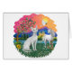 Eine weiße Devonshire Rex Katze steht im Mittelpunkt dieses Designs namens Fantasy Land, das eine goldene Burg auf einem Hügel mit einem kristallblauen Fluss, ein magisches Einhorn und eine Taube der Ruhe beinhaltet.