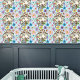Eine niedliche kleine Maus in einem blauen Bademantel mit ihrer morgendlichen Kaffee-Tasse. Hinter der niedlichen Maus befindet sich ihr Pilzhaus mit Blume.