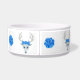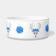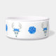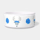 Diese Tierfutterschale ist mit fantasievollen, weißen Hirschköpfen mit großen weißen Antlers, blauen Augen und Rose auf ihren Köpfen umkreist. Hübsche große blaue Rose liegen zwischen dem Reh.
