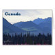Blaue Berge, blaues Wasser am See, dunkelgrüne Bäume, rosa Kaminfeuer und bewölkt. Eine Darstellung des Sommers im äußersten Norden. Es wird auch Text mit "Kanada" angezeigt. Moskitos nicht inbegriffen.