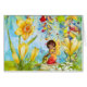 Eine skurrile und magische Illustration einer Fee unter den Blume in leuchtend farbenfroher Aquarellkunst.