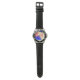 Eine Uhr mit farbenfroher Hintergrundfarbe.