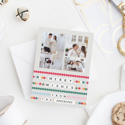 Freuen Sie sich auf den Urlaub mit dieser skurrilen "Merry Wishings"-Urlaubskarte. Freuen Sie sich auf ein spielerisches Armband-Design mit farbenfrohen Akzenten und charmanten, abgerundeten Textblasen. Diese festliche Karte ist perfekt geeignet, um drei Fotos der Familie vorzustellen. Sie verleiht Ihren saisonalen Grußkarten eine fröhliche Touch. Dieses Design ist Teil einer koordinierten Kollektion und kann mit passenden Geschenketiketten, Umschlägen und vielem mehr kombiniert werden. So lassen sich bequem und bequem eine Ferienstationiersuite erstellen. Ideal für Familien, die eine lustige, trendige und lebendige Urlaubskarte suchen, die sie mit ihren Lieben teilen können.