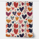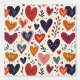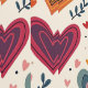 Ein charmantes Muster voller bunter, von Hand gezeichnet Herzen und zarter Blätter in warmen Tönen. Das spielerische Design mit sich überschneidenden Herzen in verschiedenen Größen und lebhaften Farben verleiht ein fröhliches und romantisches Ambiente für jeden Anlass.