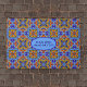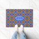 Dieses Mosaik-Design aus Blau, Orange, Rot und Grün schafft in einer alten europäischen Kathedrale ein ausgeklügeltes Fliesenmuster und bietet einen Platz, um Ihre eigene Botschaft oder andere Personalisierungen hinzuzufügen.