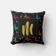 Ein Kissen personalisiert mit einem Monogramm Initial. Konstruiert mit einem eleganten Muster mit einer grafischen Abbildung von flatternden Schmetterlingen in vielen hellen Farben, die sehr schön auf dem schwarzen Hintergrund kontrastieren. Whimsikale Blumen, Zierspieße und Blätter verleihen dem Raum einen gewissen Charme. Ein schwarzer Rahmen mit einem goldfarbenen Rahmen überlagert mit personalisiertem Text.