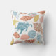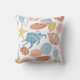 Dieses Kissen im sommerlichen Strandkissen mit farbenfrohen Muscheln in Blau-, aquamarin- und Korallentönen auf weißem Hintergrund.