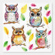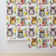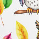 Niedliche Uhus und fallende Blätter in der Illustration Tapete in braun, rosa, grün, blau und gelb. Niedlich für ein Kinderzimmer, ein Kinderzimmer oder ein Zimmer in einer Hütte im Wald.
