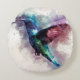 Das ist ein rundes Kissen, das mit einem handgefertigten Bild einer Aquarellmalerei versehen ist, die einen Kolibri im Flug zeigt. Die vorherrschenden Rosa-, lila- und Blautöne des Kolibris werden durch weitere Wasserfarben unterstrichen. Dieses Design würde jeden Anzug, der schöne Vogelbilder mag, sowie Pastellfarben und mutige Schmuckfarben.