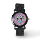 Der in Blau und Rosa gestaltete Zuckerschädel ist von bunten Blume und Herzen umgeben.