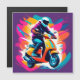 Eine lebendige Kunstillustrierung, die ein Individuum auf einem orangefarbenen Roller zeigt, umgeben von dynamischen Splash von lebhaften Farben und Bewegung. Erfasst Energie, Kreativität und moderne Lifestyle-Themen.