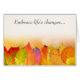 Eine Reihe farbenfroher Herbstblätter, die in Rot, Grün, Orange und lila beginnen und in leuchtendem Gold enden, schmücken die untere Seite dieser Grußkarte. Der graue Text oben sagt derzeit: "Die Veränderungen des Lebens eindämmen..." und innen steht: "..und wissen, dass ich dich unterstütze." Der gesamte Text ist leicht angepasst, sodass Sie diese Karte sagen lassen können, was Sie wollen. Geeignet für viele Gefühle.