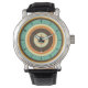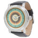 Ein farbenfrohes, modernes Design aus konzentrischen Kreisen in harmonischen Farben, mit stylischen Zahlen und Stunden und Minuten Maßstab.