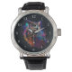 Farbenfrohe Weltraumschwärze farbiges Universum zwischen, schöner zeichnend wilder Zweig, Weltraum-Illustrationsvogel, Tiermalerei bunten Eule,