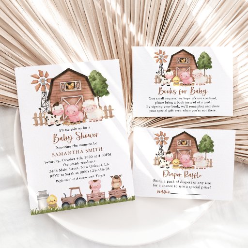 Add a personal touch to your baby shower celebration with these stylish and memorable party items! Design features farm animals (cow, horse, sheep, pig, rooster, chicken), brown barn and brown tractor on white background.