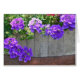 Dieses Bild zeigt auffallende rote und lila Blumen, die über die Seite eines Weinfass ziehen.