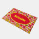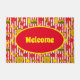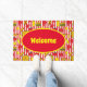Farbenfrohe Begrüßungsmatte mit heißen Hunden, Burgern, Ketschup-Töpfen und Senfflaschen auf roten und weißen Streifen. Ideal für Tore, Restaurants und Bar Eingänge oder Fest-Hot-Dog Karren