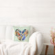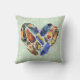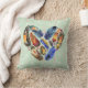Ein niedliches und romantisches Kissen mit einem Aquarellbild von Federn in Herzform. Die Farben sind gelb, orange, blau, grün und braun. Manche haben Streifen, Punkte, Stammesmuster und andere einzigartige kreative Gestaltungen. Set auf Vintagem, minzgrünen Hintergrund mit verblassten rosa und weißen Polka Punkten.