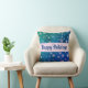 Fest Blau Pink Snowflake Muster Happy Holidays Throw Kissen. Das Design hat rosa Schneeflocken in verschiedenen Formen und Größen auf einem blau-türkisfarbenen Hintergrund. Sie können den Text ändern.