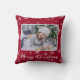 Fest Rote Schneeflocken Frohe Weihnachts-Foto Kissen. Personalisieren Sie dieses Weihnachtskissen mit Ihrem Foto und Text. Das Design hat weiße Schneeflocken in verschiedenen Formen und Größen auf einem roten Hintergrund. Dieses Kissen ist ein personalisiertes Weihnachtsgeschenk für Ihre Familie oder Freunde.
