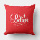 Dieses Feiertags-Wurfkissen wird mit einem Believe-Druck in einer eleganten Schrift angezeigt.
