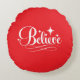 Dieses Feiertags-Wurfkissen wird mit einem Believe-Druck in einer eleganten Schrift angezeigt.
